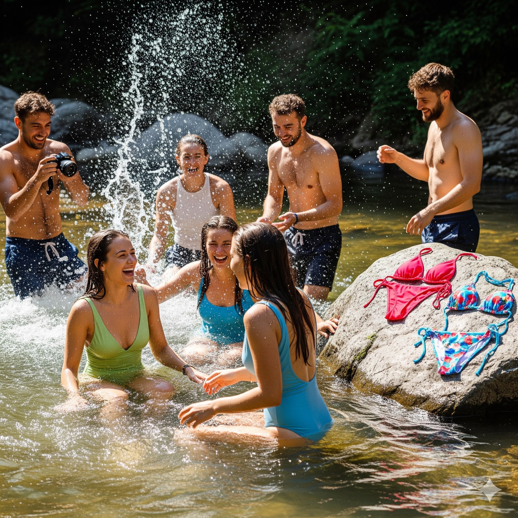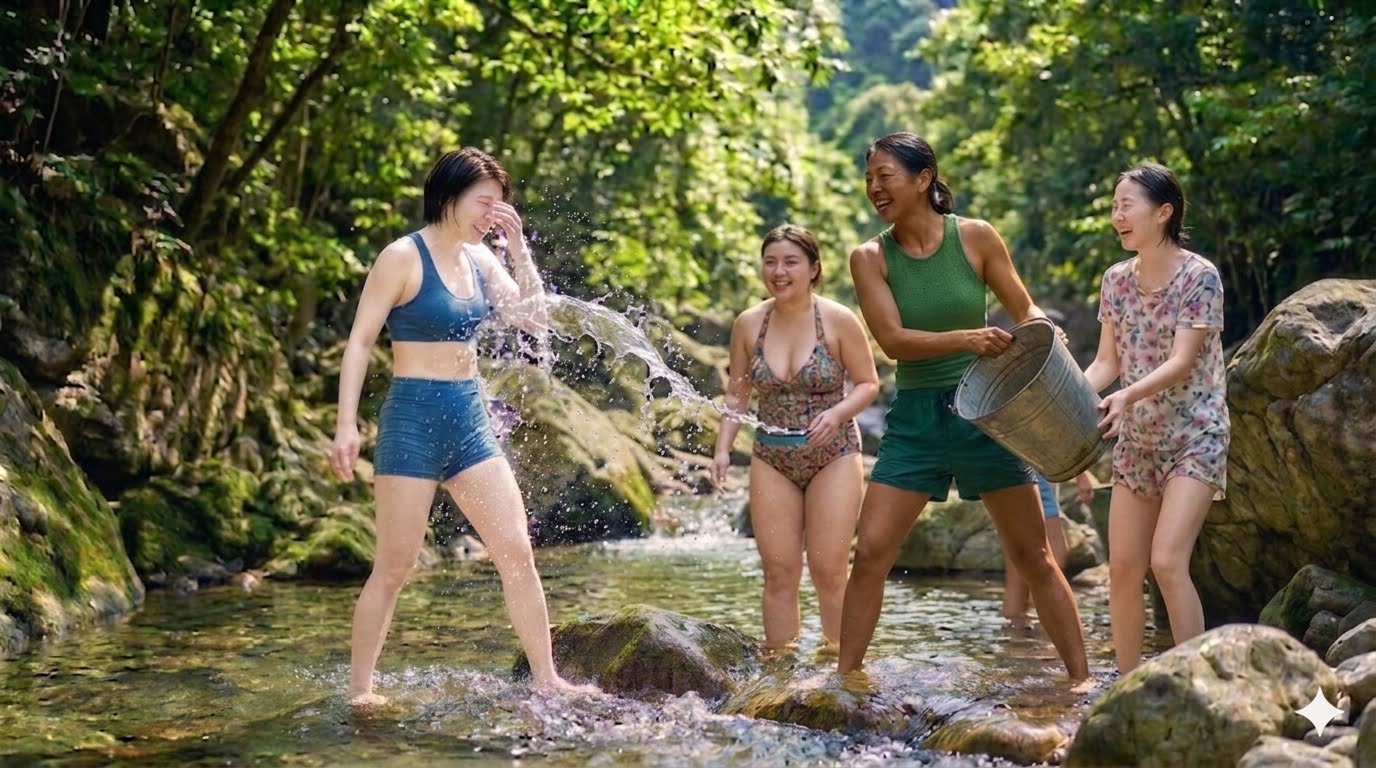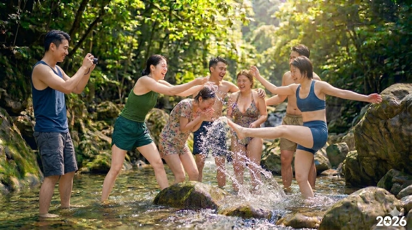 那是2026年3月下旬的一个午后,山里的阳光有些毒辣,却把溪水照得像碎钻一样晃眼。我们这群刚踏入职场的大学死党,像脱缰的野马一样冲进溪谷。穿着花色与褐色泳衣的莉莉和小雅,原本正站在溪石中央戏水,笑声在山谷里回荡。