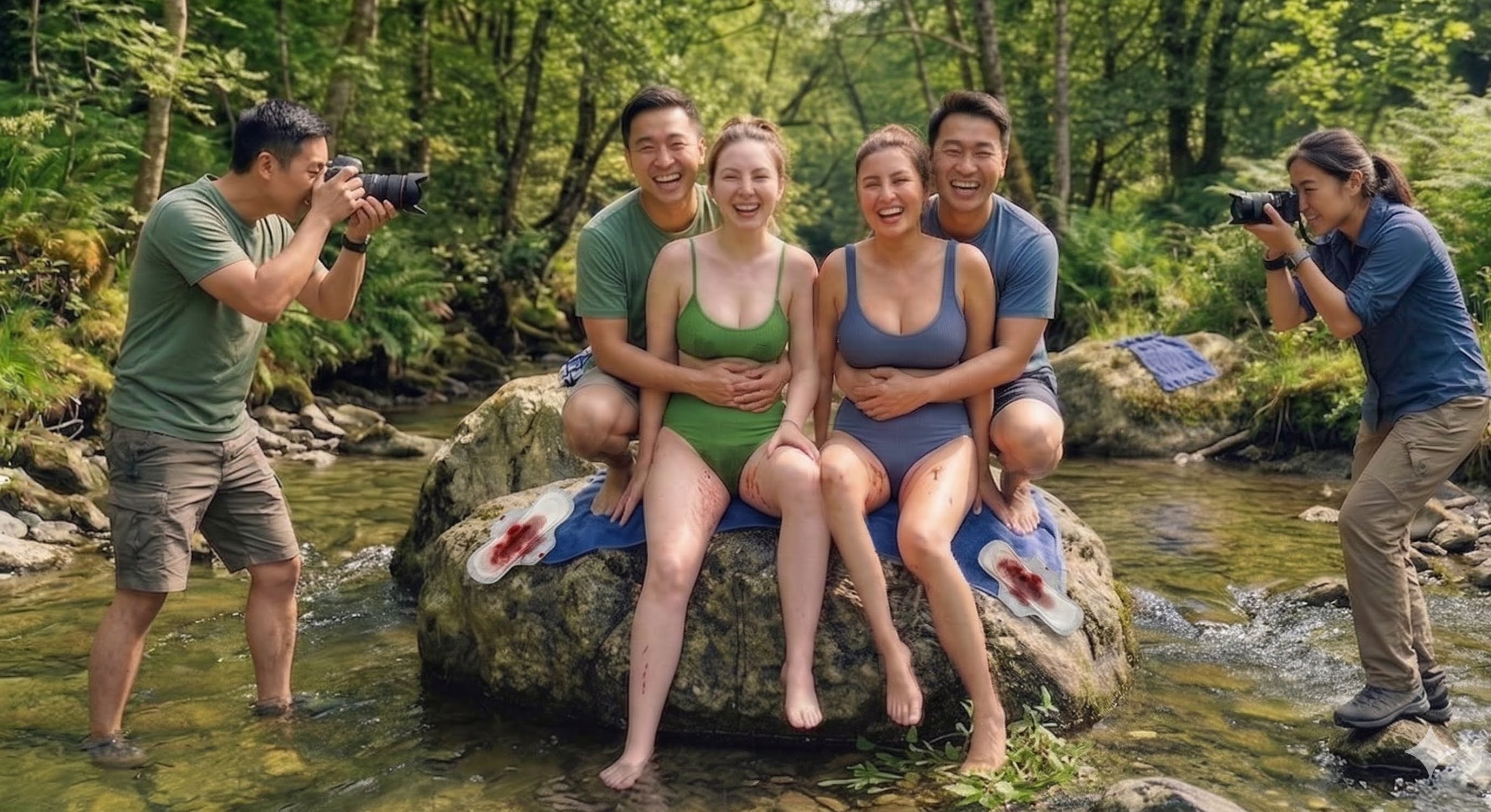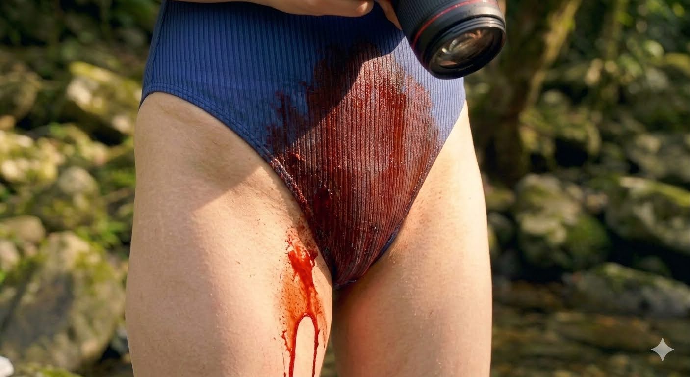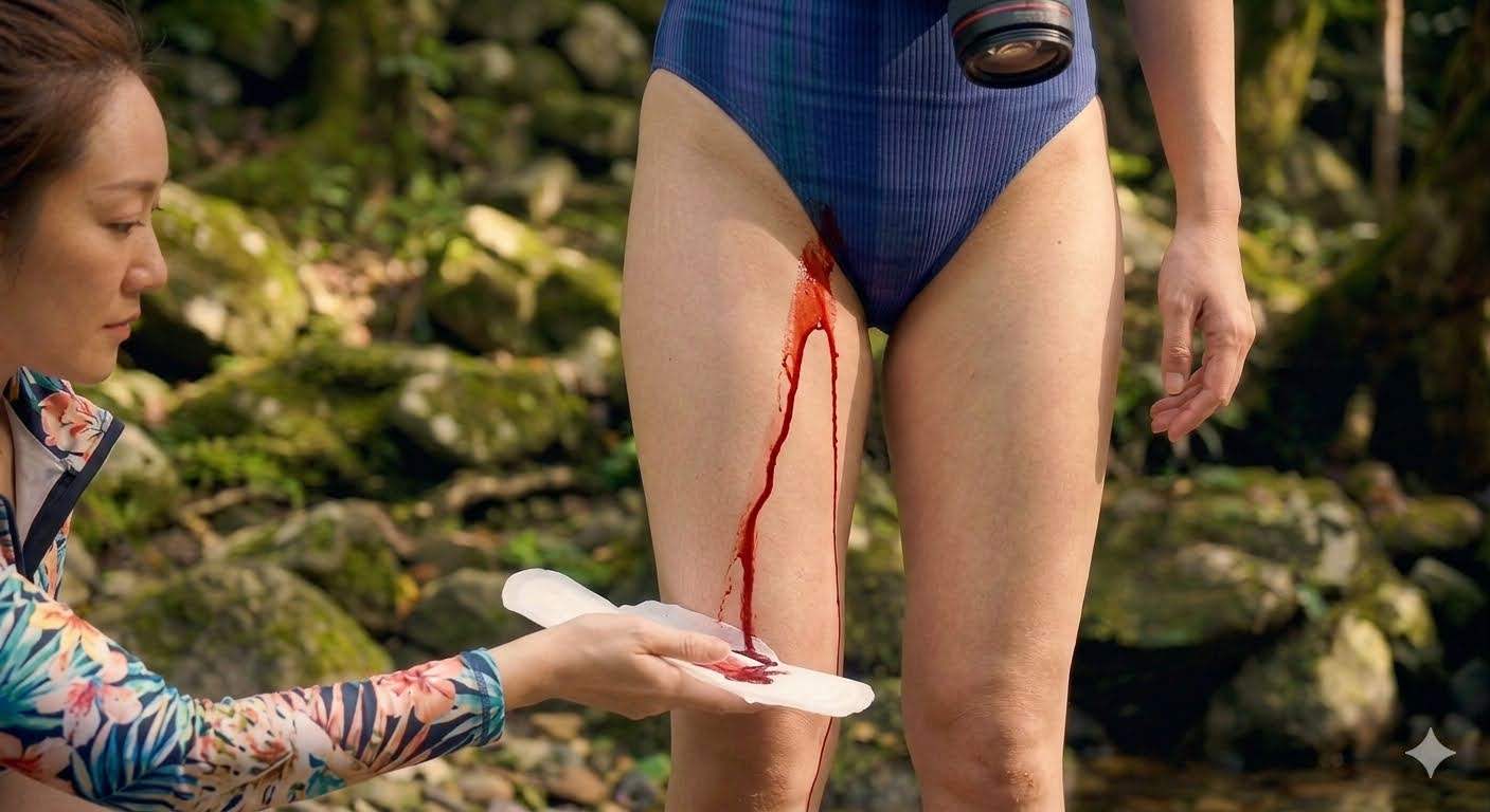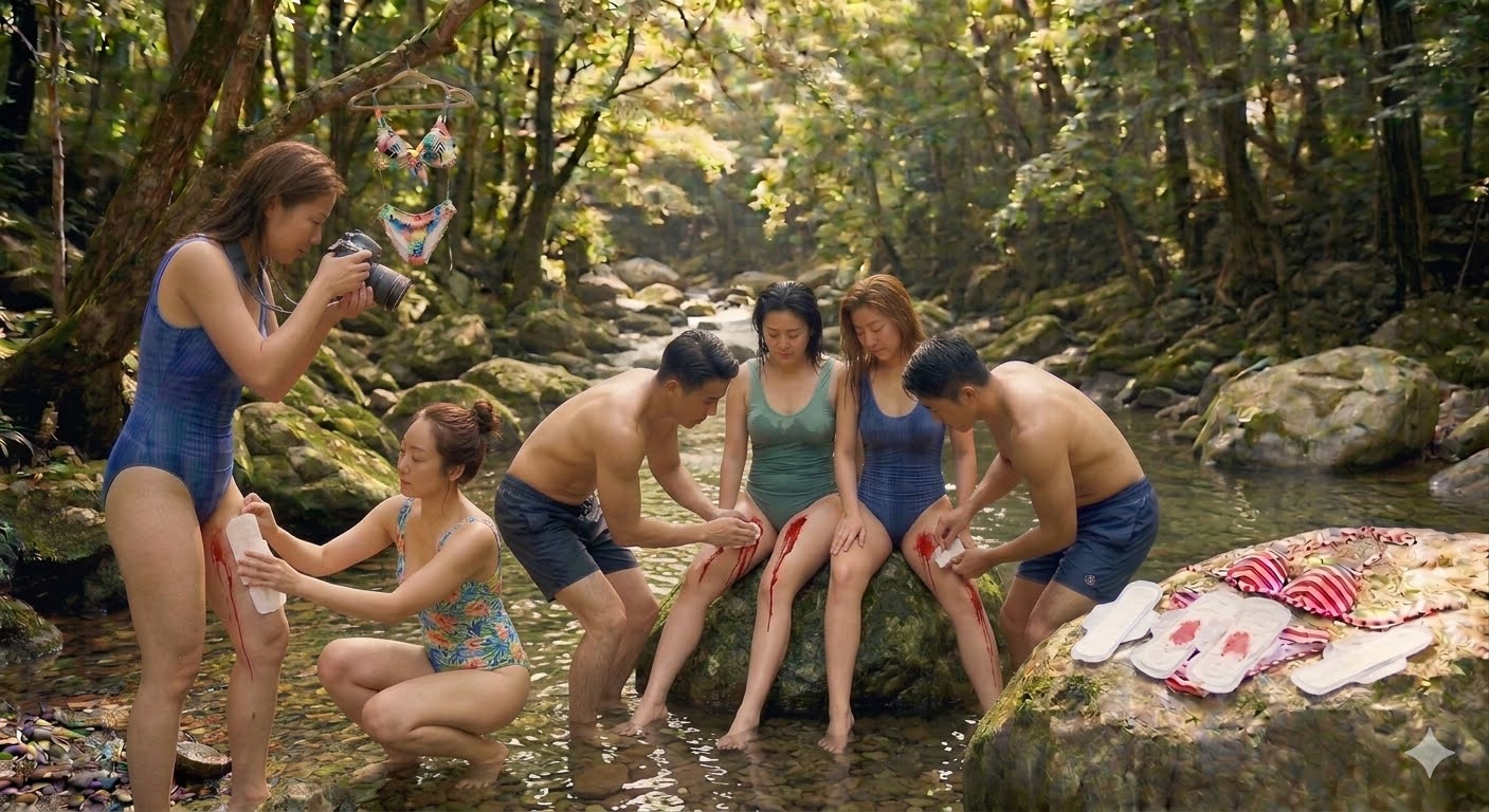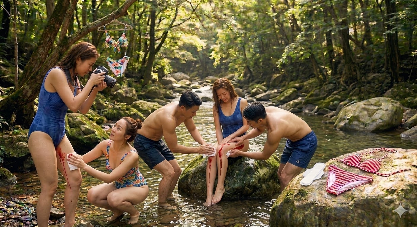 由于剧烈运动和山水的凉意,莉莉和小雅的生理期不约而同地提前了。透过阿明(我们的随团摄影师)的长焦镜头,那一幕被定格成了震撼的视觉冲击:在清澈见底的溪水中,在她们湿透的泳衣边缘,两道刺眼的鲜红顺着大腿内侧缓缓流下。那是生命最原始的颜色,但在那一刻,对于任何一个女孩子来说,这都是足以导致“精神崩溃”的社死现场。