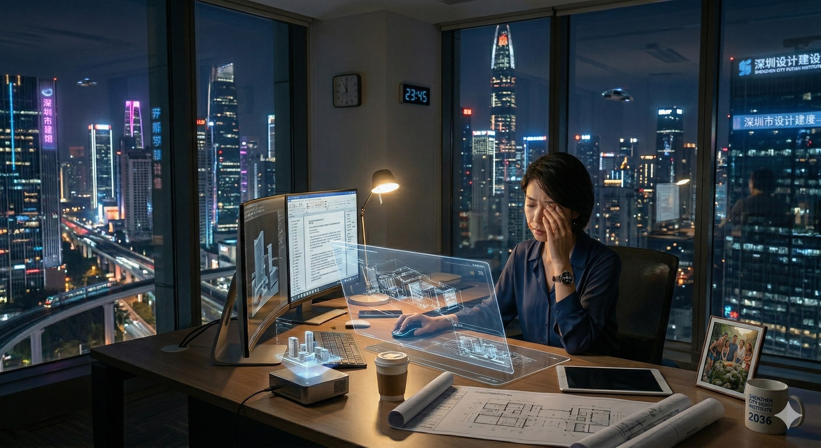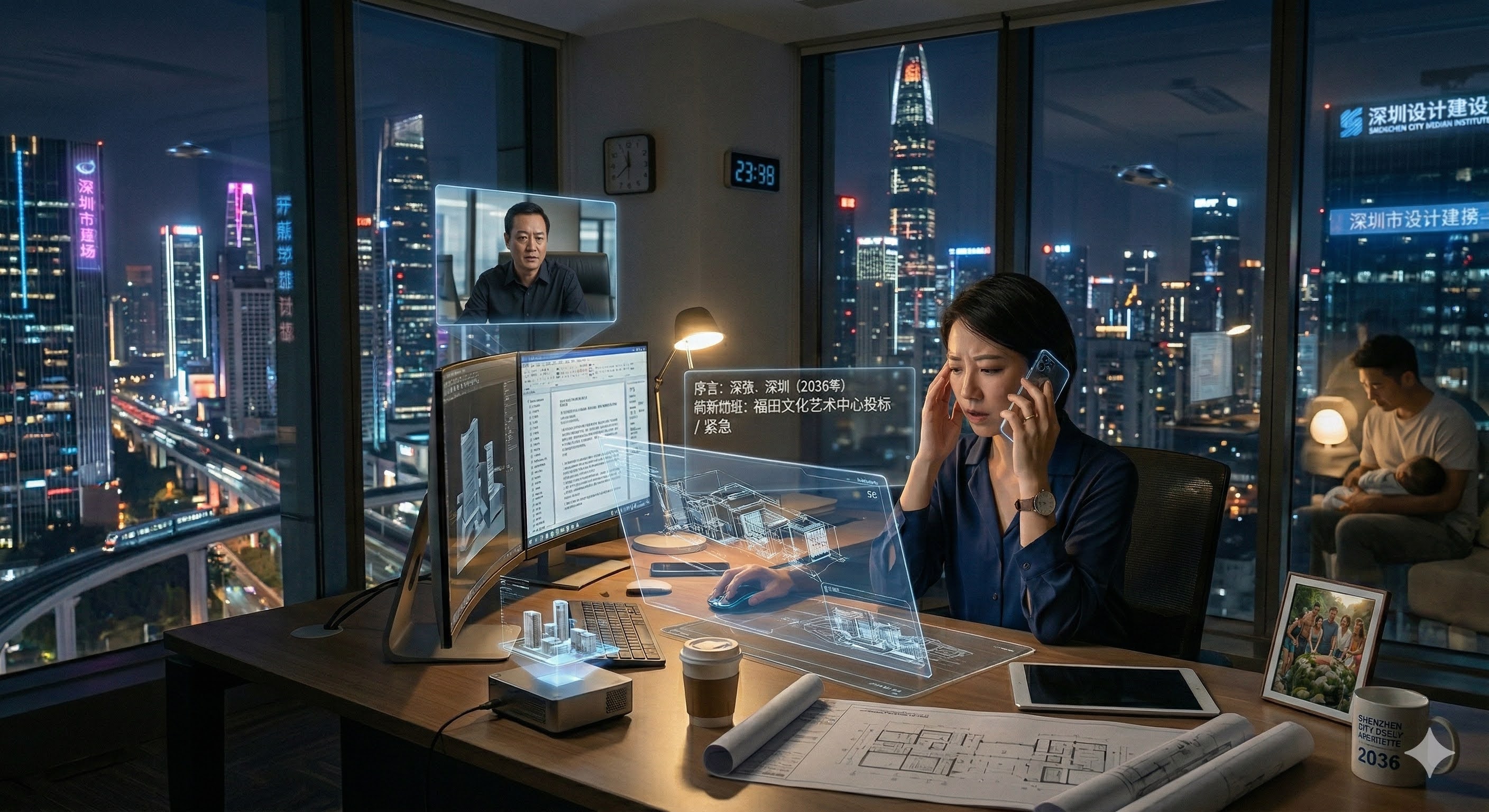 2036年的深圳,深夜11点半,福田区的某栋高档写字楼依然灯火通明。莉莉坐在25楼的落地窗前,揉了揉发酸的眼角。她是深圳一家顶级建筑设计院的设计总监,同事们眼中的“铁娘子”,也是一个5岁男孩的母亲。