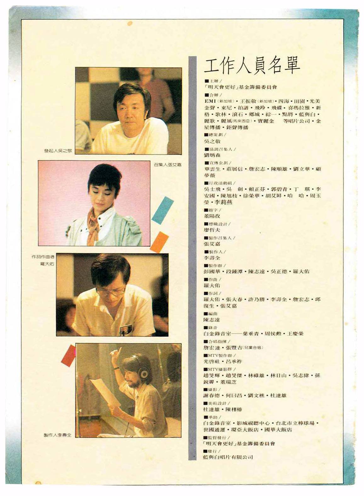 中國國民黨並未正式擔任歌曲的發起單位,而是以民間自行發起的形式出現。專輯製作單位是以「明天基金會籌備會」的名義執行,發起理由為藝人希望動用力量,為社會做「啦啦隊」,做一點打氣工作[3]。邀請羅大佑進行詞曲創作,邀集的華人歌手跨越不同地域、不同唱片公司,打破了簽約的限制,邀集台灣當時最知名的唱片公司包括飛碟唱片、喜瑪拉雅音樂、新格唱片、歌林唱片、滾石有聲出版社、鄉城唱片、寶麗金唱片、麗歌唱片、光美文化、上華唱片、點將唱片、科藝百代、福茂唱片等參與這張專輯,並由各家唱片公司競標發行權。
