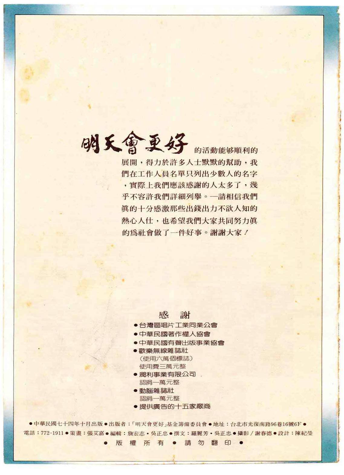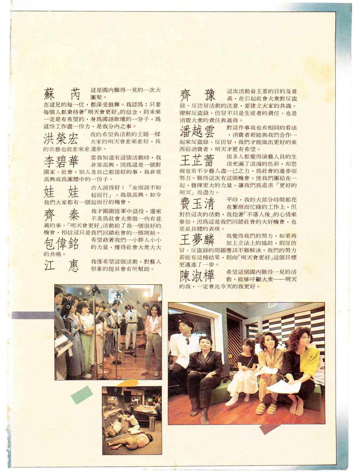 當時台灣唱片市場的盜版、盜錄問題十分嚴重,加上曾有媒體以「海盜王國」形容台灣生產名牌仿冒品的猖獗情形,對台灣的國際形象傷害頗大,故「反盜版」、「反盜錄」、「反仿冒」也成為許多參與歌手強調的主題。[6][註 3]网民的分享: