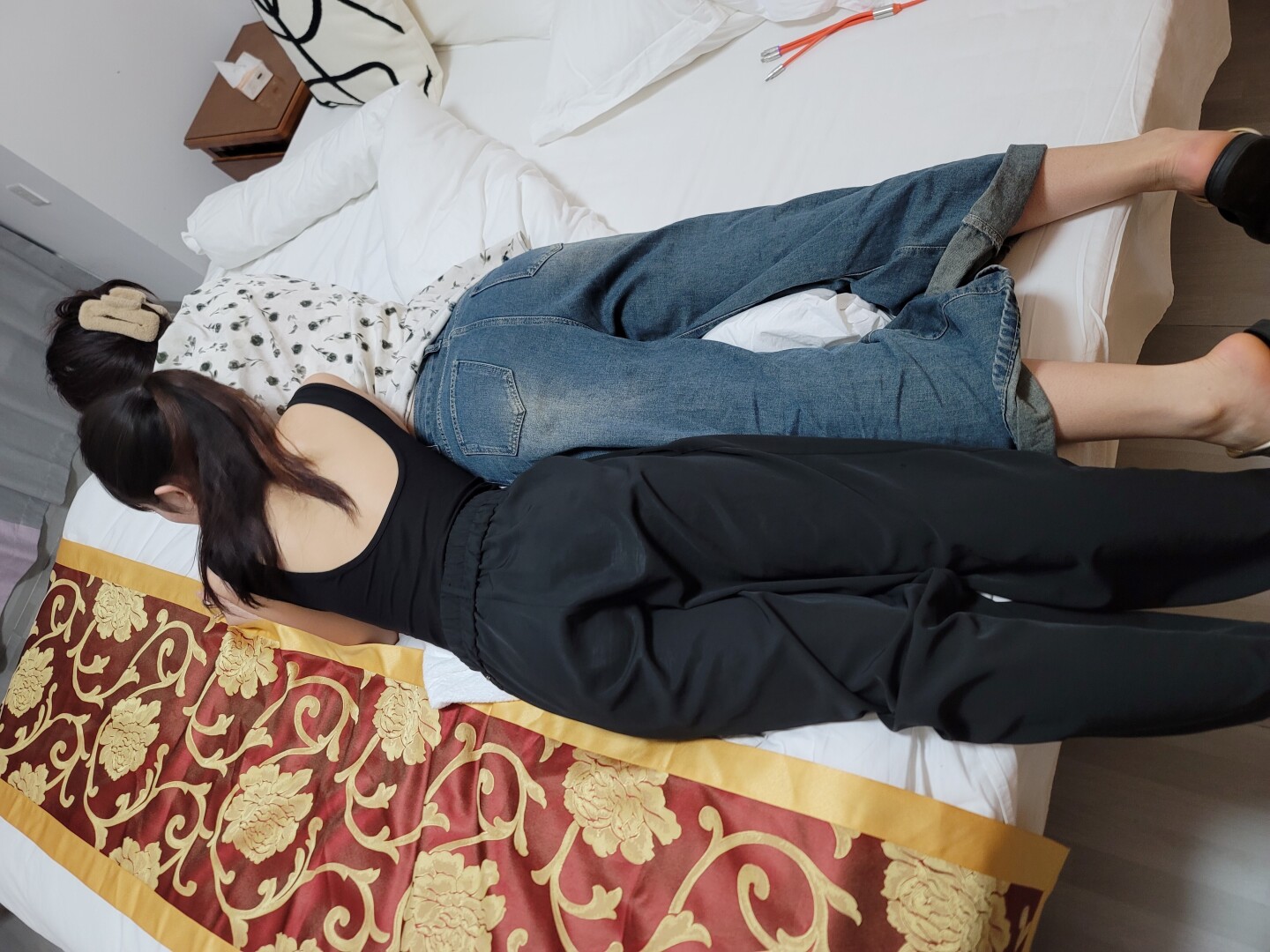射完一起洗澡,半个小时左右,老五也来了,一来她们2个就躺在床上玩手机,聊八卦。