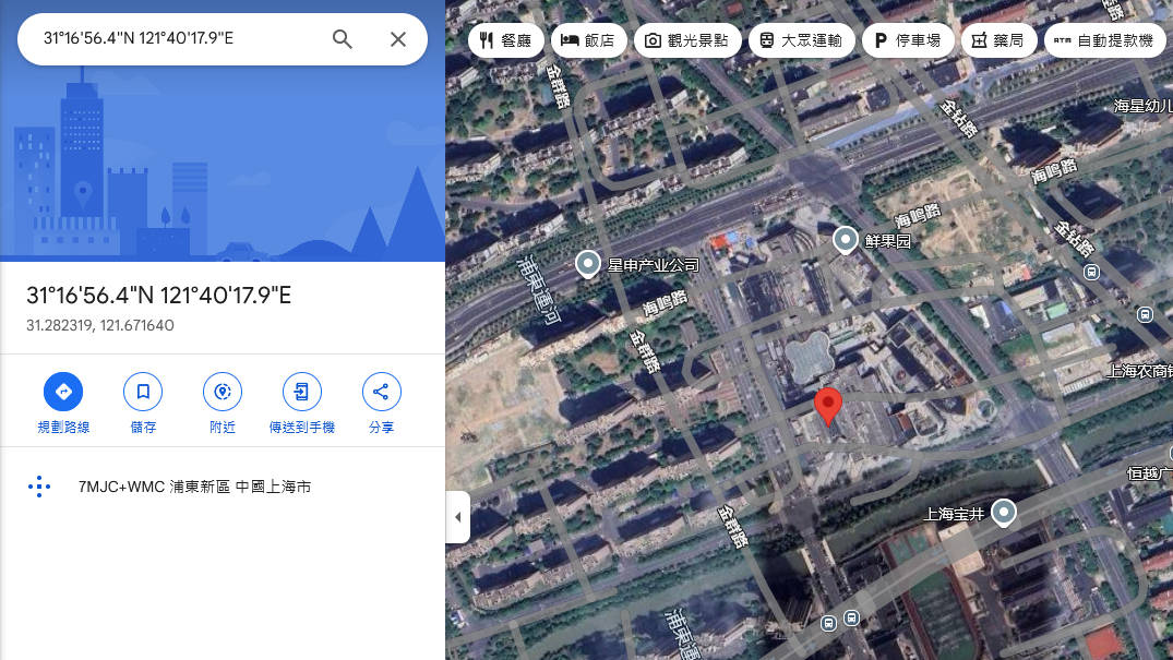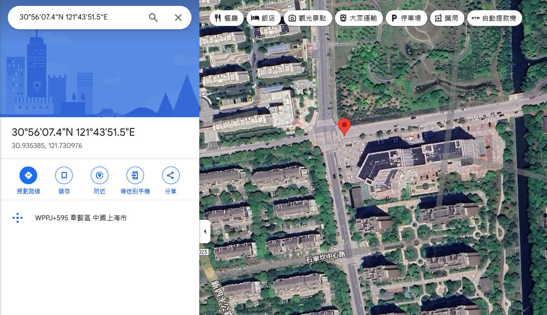 • 31°16’56.4″N 121°40’17.9″E 31.282319, 121.671640