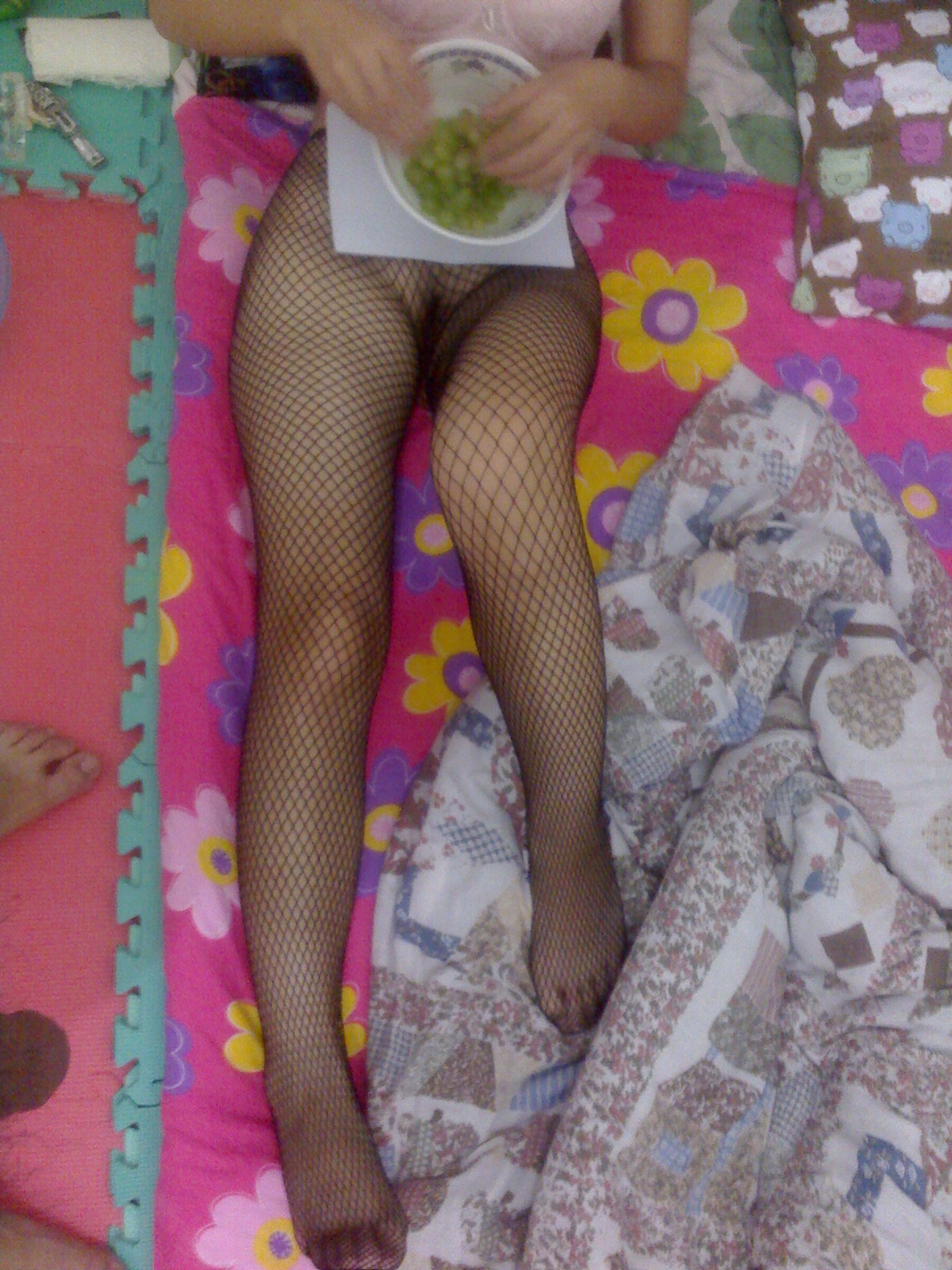 骚货穿渔网袜没穿内裤张开大腿,肚子上放碗吃普通,然后被脱下渔网袜插逼