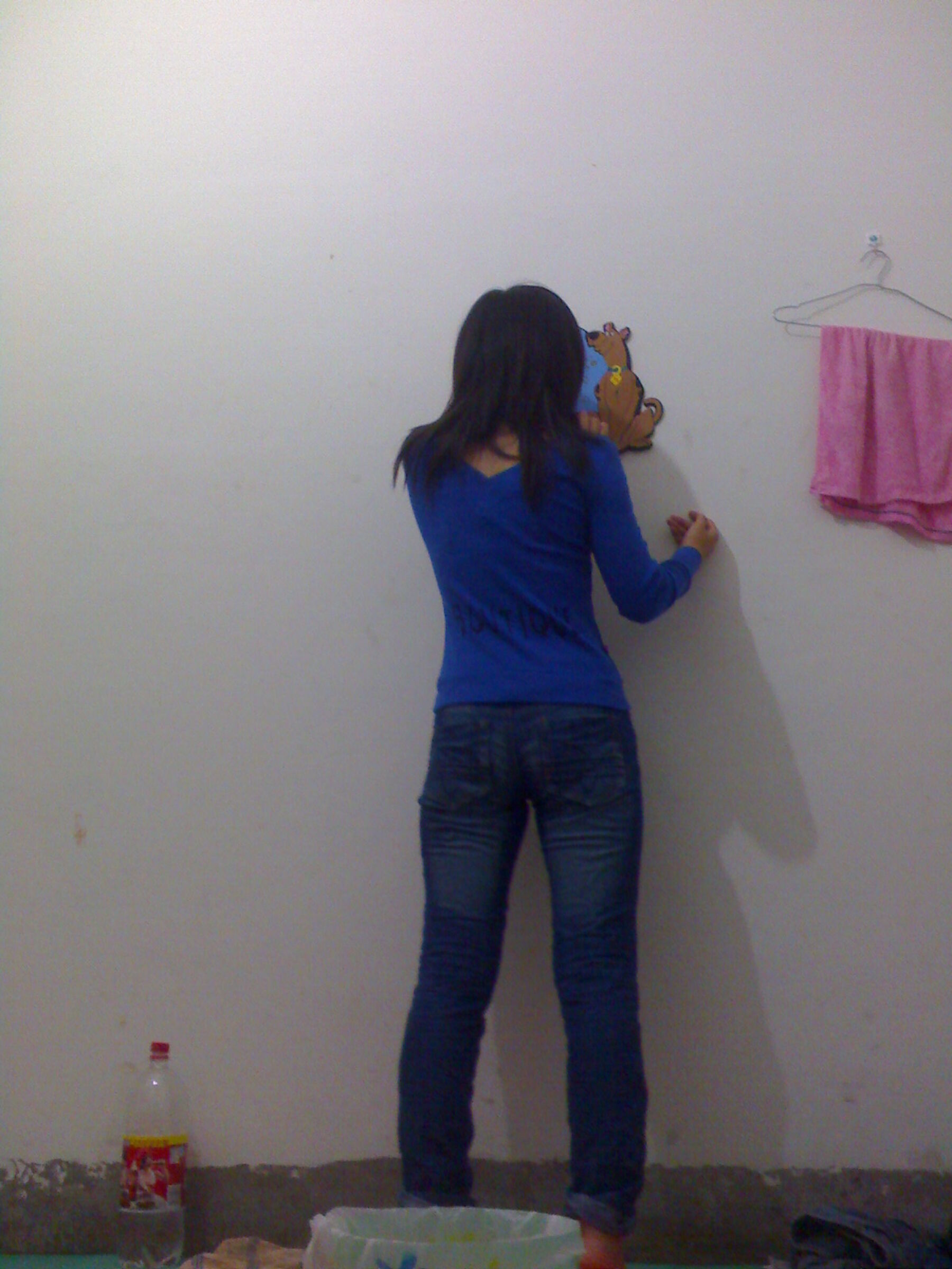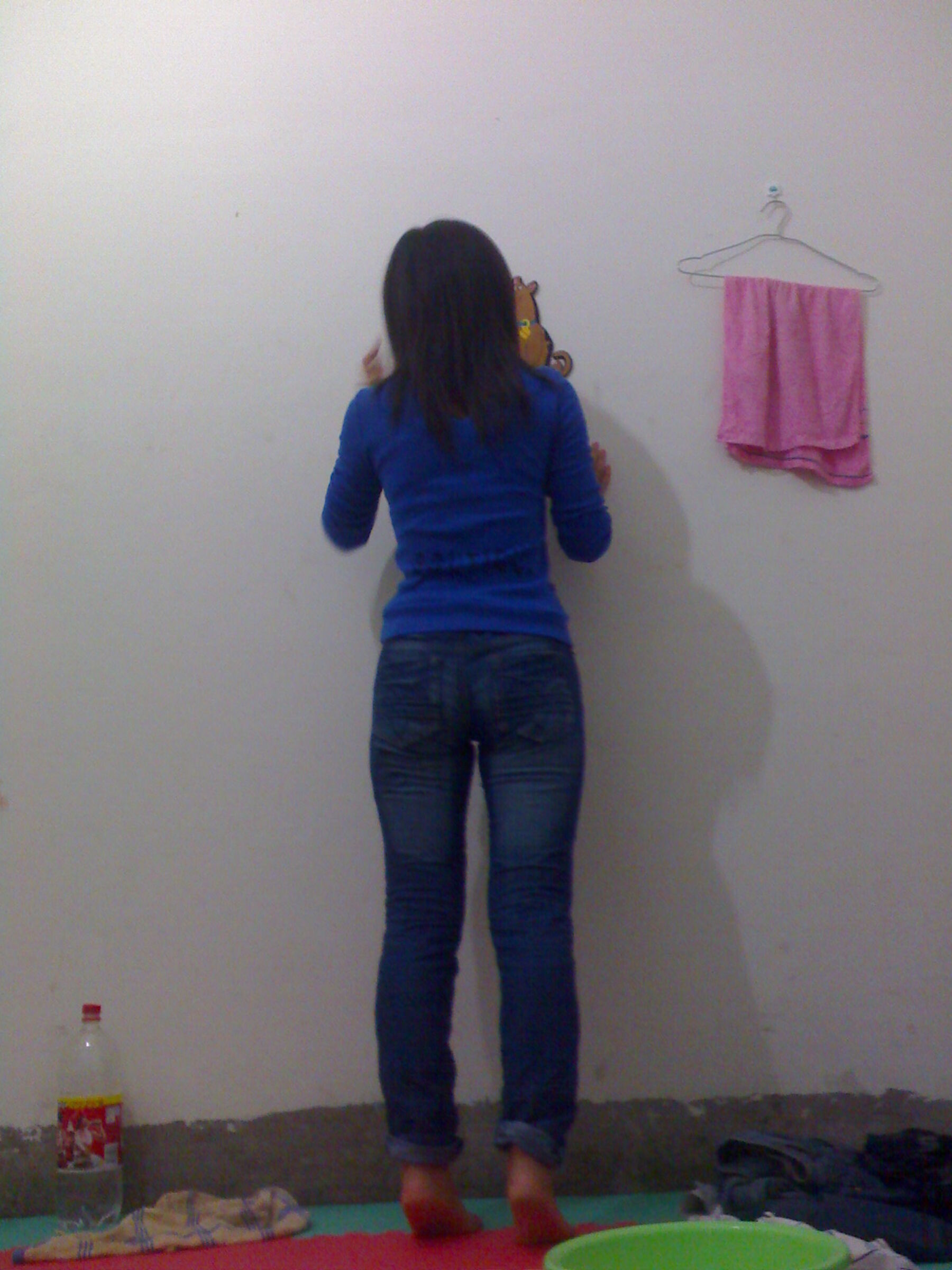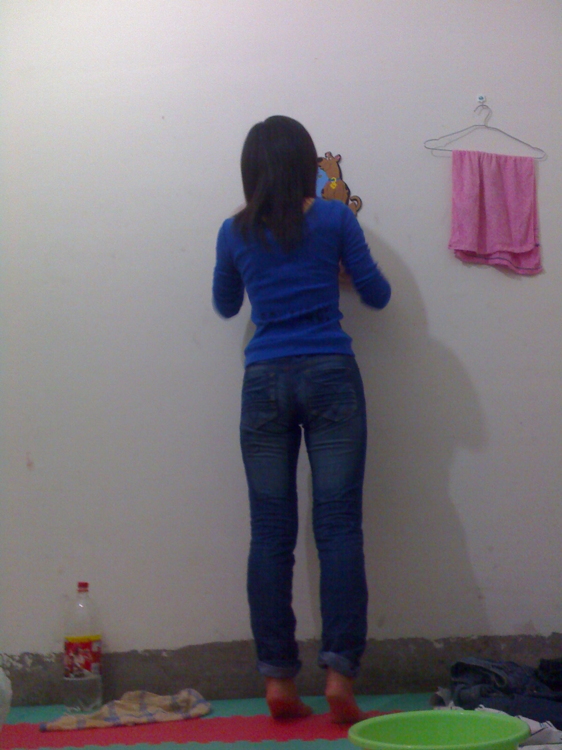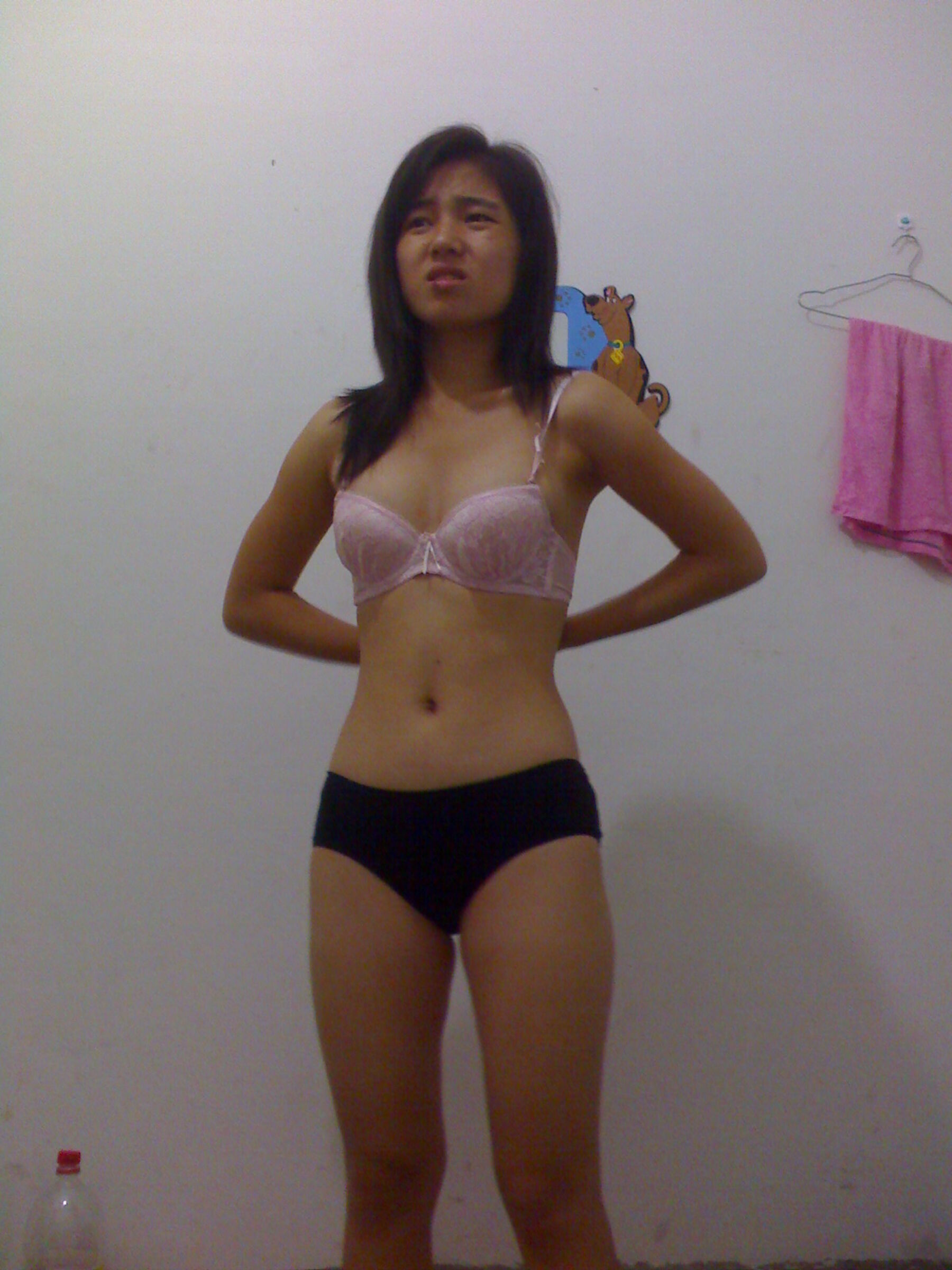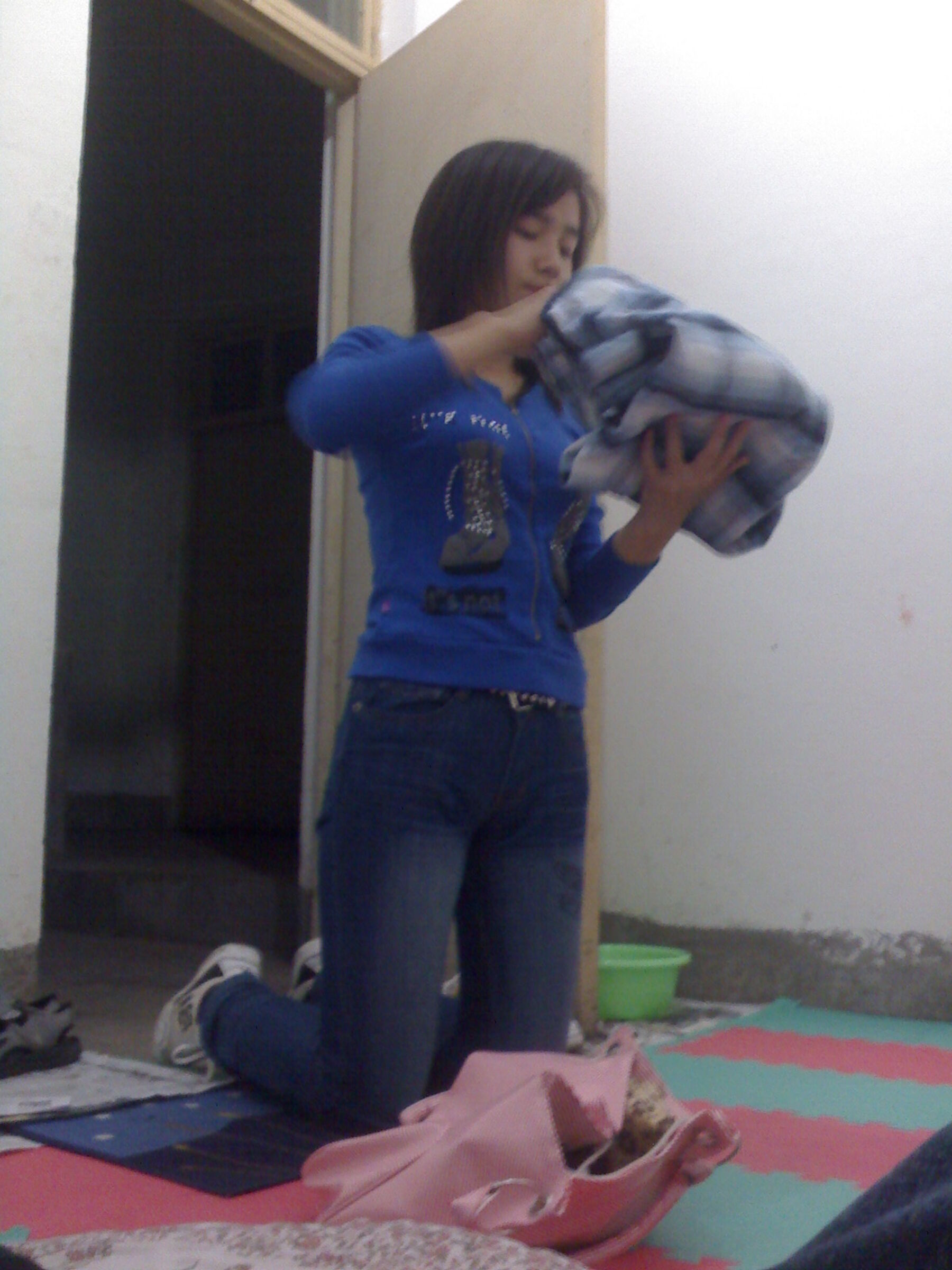 给男人舔龟头和蛋蛋,在墙角蹲在尿到脸盆,然后被肉棒插逼后入,事后穿回奶罩内裤和外衣